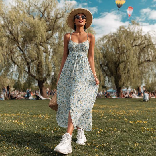 Bohemian comfortable chic. Flowing printed maxi with casual sneakers creates relaxed spring weekend style.