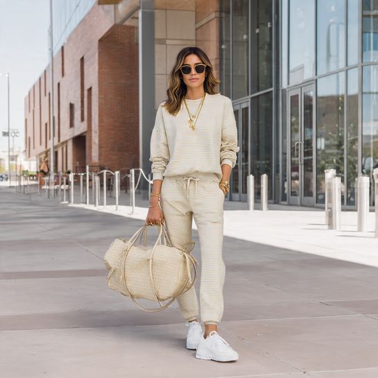 Refined athletic leisure. Coordinated elevated sweatshirt and pants with quality accessories creates polished casual.