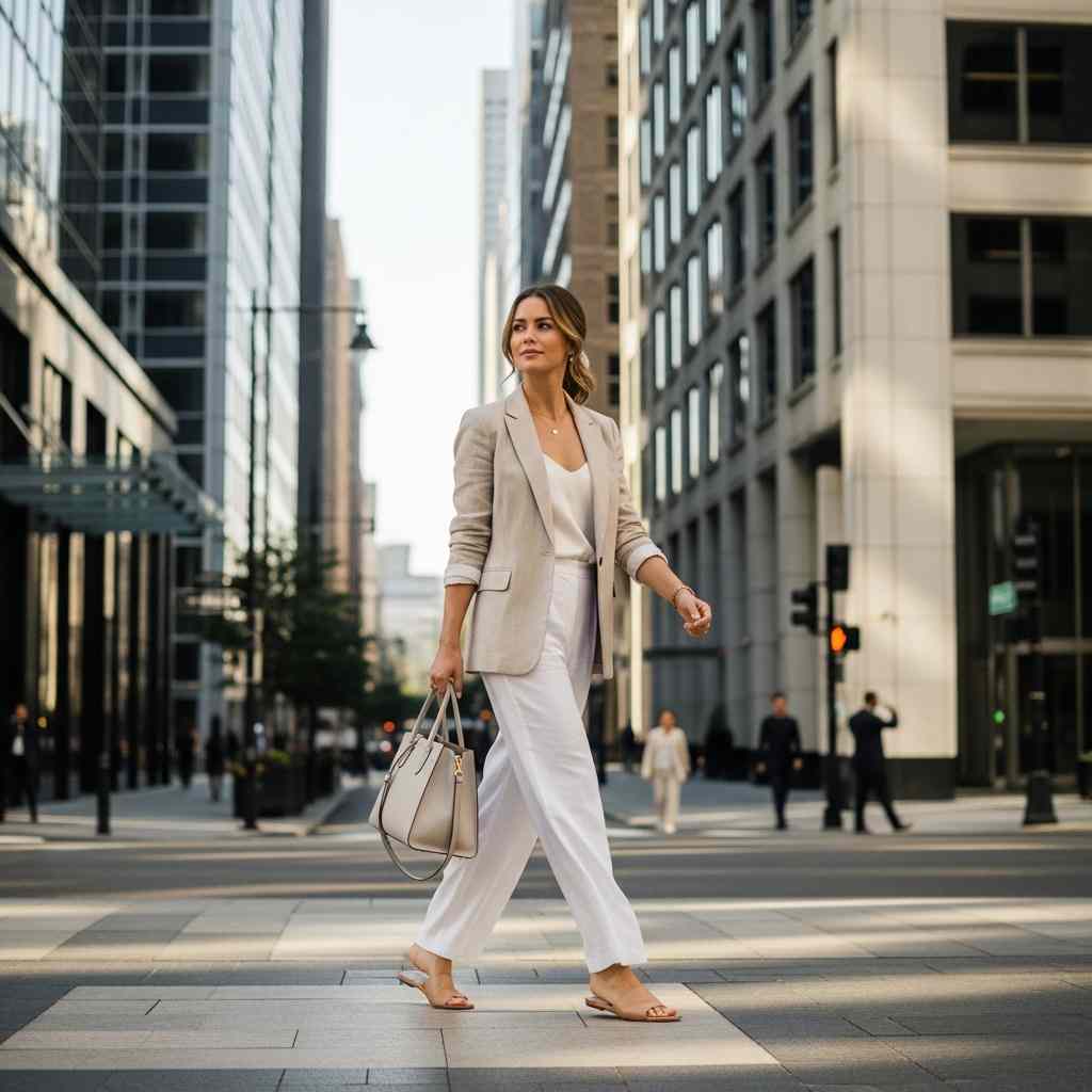 Breezy professional sophistication. Unstructured linen blazer with flowing pants in complementary neutrals creates comfortable work style.