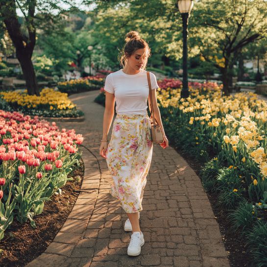 Feminine balanced casual. Bold floral skirt paired with plain white tee creates perfect high-low mix.