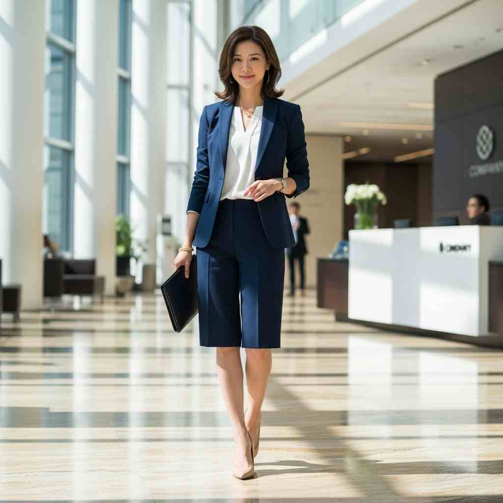 Polished warm-weather professional. Bermuda shorts with structured jacket creates sophisticated spring business casual.