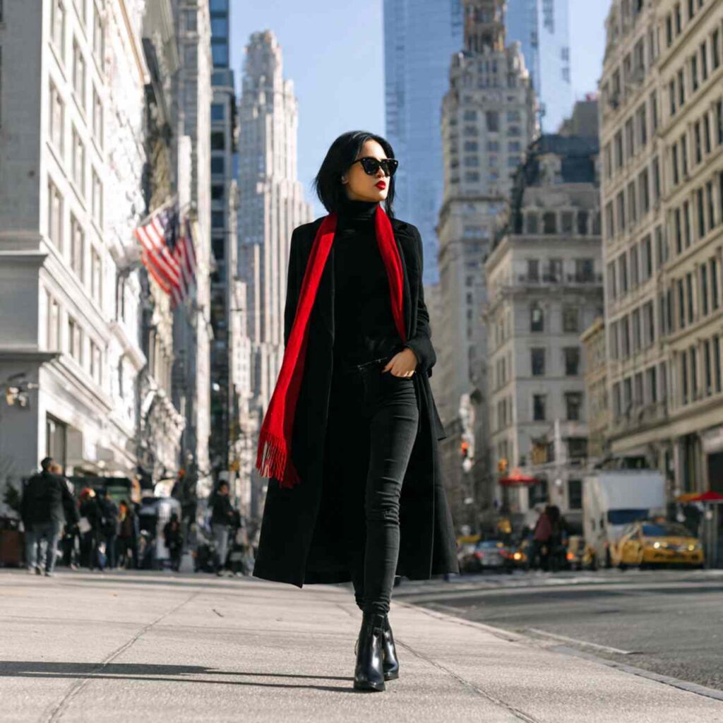 Black turtleneck, black jeans, black chelsea boots, topped with a long black wool coat. Add one piece of color—red scarf, camel bag, or bold lip. The NYC uniform perfected.