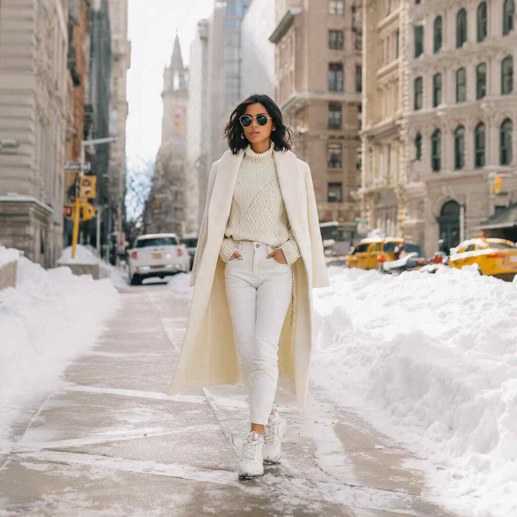 White jeans or pants with white sweater and cream coat creates unexpected winter brightness.