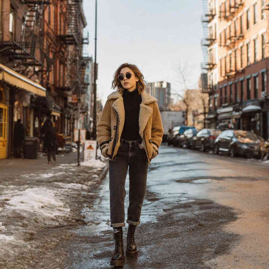 A classic aviator shearling jacket over jeans and boots creates vintage-cool warmth.