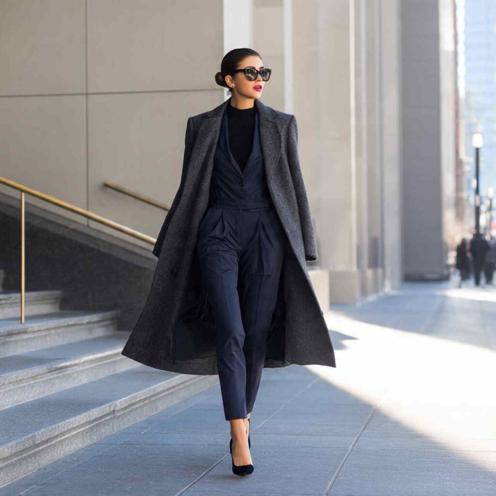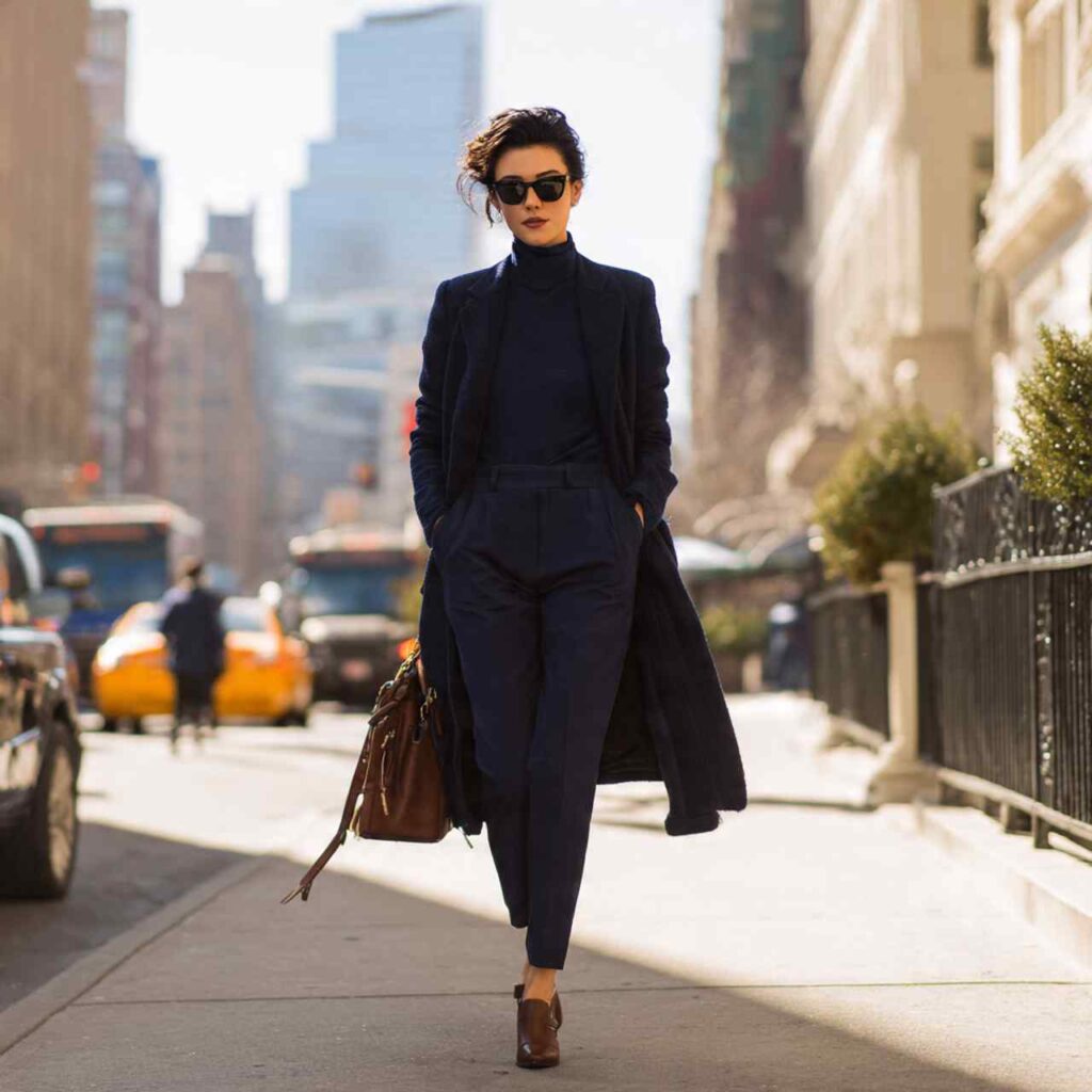 Why It Works for NYC: Navy is professional, slimming, and slightly softer than black. Monochrome navy looks expensive and intentional.
