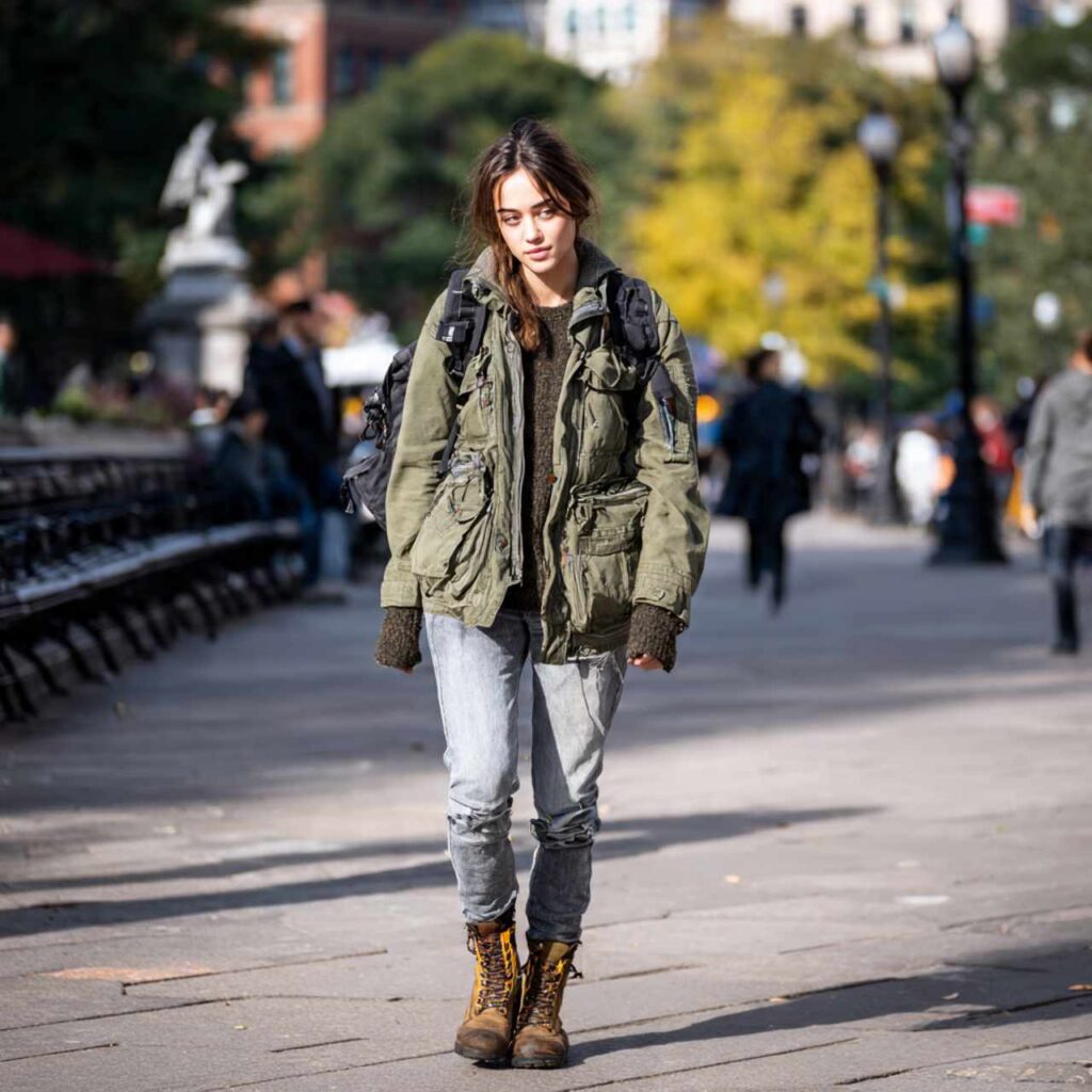 A practical, warm, long parka in olive or black over work clothes creates function-first NYC winter.
