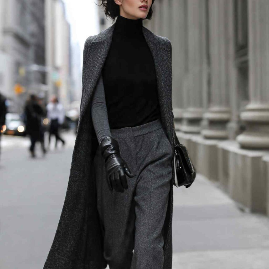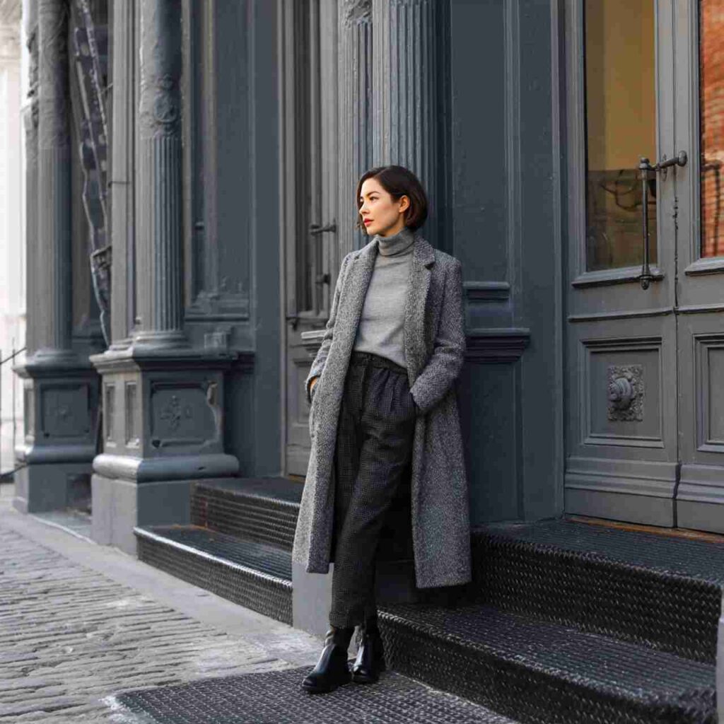 All grey outfit—grey turtleneck, grey wool trousers, grey coat—in varying shades creates sophisticated minimalism.