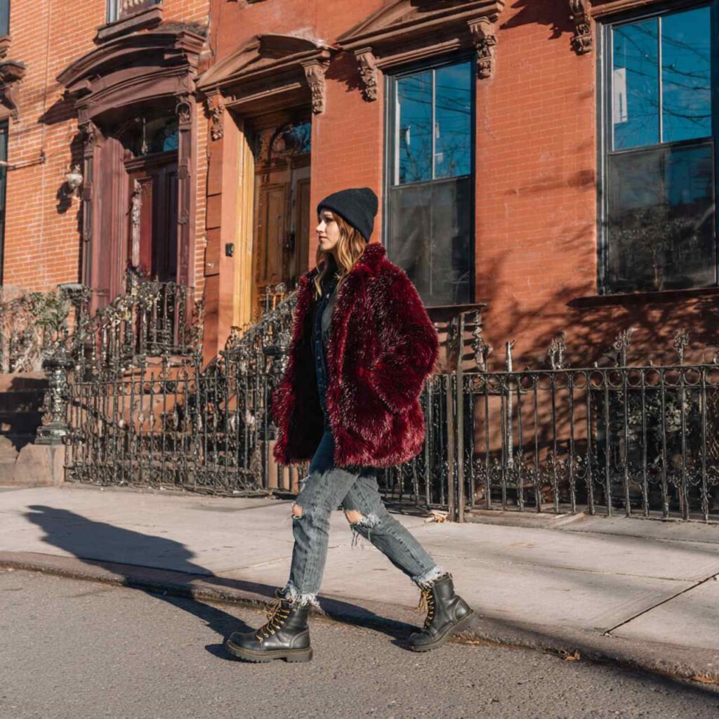 A mid-length faux fur coat in a bold color over jeans and boots creates texture and warmth. Very Brooklyn chic.