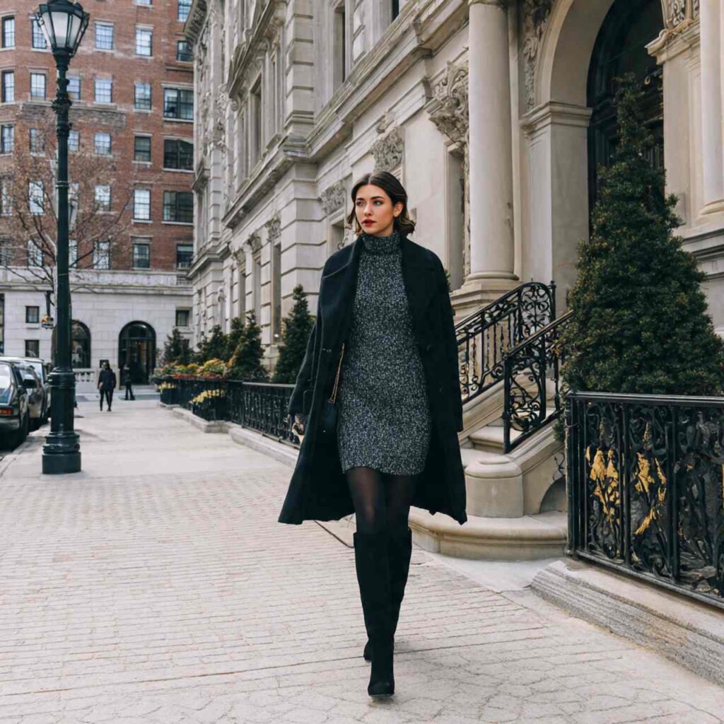 Why It Works for NYC: Sweater dresses eliminate waistband pressure during long days. Fleece-lined tights add warmth without bulk. This outfit transitions from office to dinner seamlessly.