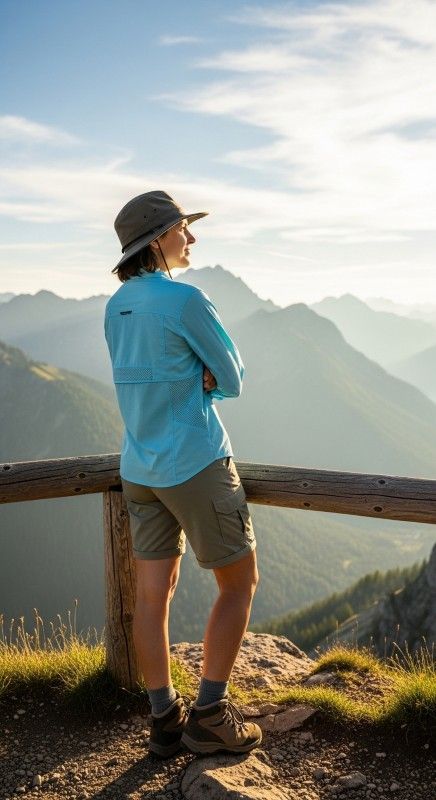 This sky blue breathable button-up features ventilation panels under the arms and across the back while the lightweight fabric provides UPF 50+ sun protection without trapping heat. The relaxed fit allows easy layering while the roll-up sleeves with keeper tabs stay secure during active movement and technical sections. Paired with khaki convertible shorts that zip off to transform into hiking shorts, this outfit adapts to changing conditions and activity levels throughout your day. The shorts’ multiple secure pockets hold essentials while the quick-dry fabric handles sweat and unexpected weather changes with ease. Sky blue is calming and refreshing, creating a peaceful vibe on the trail while photographing beautifully against mountain and forest backdrops. This versatile combination transitions from early morning coolness to midday heat while maintaining style and performance from trailhead to summit.