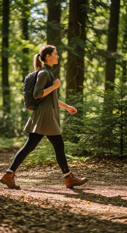 This olive sun-protective tunic provides extended coverage with a flattering A-line silhouette that flows over hips and thighs while the lightweight, breathable fabric prevents overheating. The three-quarter sleeves protect arms from sun and brush while the moisture-wicking properties keep you comfortable during long miles and elevation gain. Paired with black performance leggings featuring side pockets and a supportive waistband, this outfit combines modest coverage with athletic functionality for all-day trail comfort. The leggings’ compression fabric supports muscles reducing fatigue while the moisture-wicking properties prevent chafing during repetitive movement. Olive green is practical and stylish, blending with natural surroundings while showing less dirt than lighter colors during muddy trail sections. This comfortable combination is perfect for women who prefer more coverage while maintaining breathability and performance on summer hiking adventures.