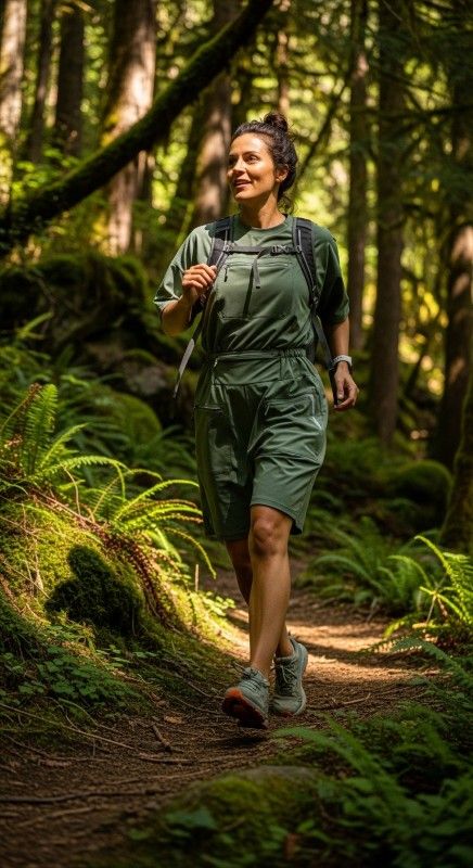This forest green quick-dry romper combines one-piece convenience with serious trail performance featuring moisture-wicking fabric and multiple secure pockets for essentials. The relaxed fit through the body allows unrestricted movement while the shorts length provides coverage and breathability for summer hiking conditions. The built-in waistband with drawstring ensures a secure, customizable fit while the gusseted crotch prevents binding during high steps and technical terrain. Multiple zippered pockets hold phone, keys, and snacks without creating bulk or bouncing during active movement on challenging trails. Forest green is practical and stylish, blending with natural surroundings while hiding dirt and stains better than lighter colors. This easy one-and-done outfit eliminates outfit guesswork while delivering performance and style for moderate day hikes and outdoor adventures.