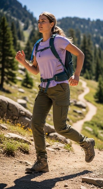 This lavender mesh-panel tee maximizes ventilation with strategic mesh inserts across the shoulders and back while the moisture-wicking fabric keeps you dry during intense summer hikes. The relaxed fit promotes airflow while the slightly longer hem provides coverage during bending and reaching movements on technical terrain. Paired with olive utility pants featuring multiple cargo pockets and reinforced knees, this outfit balances breathability with durability for challenging trail conditions. The pants’ quick-dry fabric handles sweat and weather while the articulated design prevents binding during high steps and scrambling sections. Lavender is refreshingly unique on the trail, helping you stand out in group photos while the performance fabrics ensure all-day comfort and confidence. This ventilated combination is perfect for hot weather hiking, humid conditions, or any adventure where temperature regulation is essential.