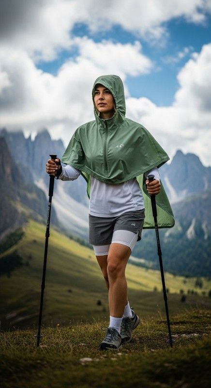 This sage lightweight poncho provides versatile weather protection and sun coverage with breathable, packable fabric that layers easily over your hiking base layers. The relaxed, flowy design allows unrestricted movement while the hood protects your head and neck from sun or unexpected rain showers. Layered over a white moisture-wicking base and paired with charcoal hiking shorts, this outfit adapts to changing mountain conditions throughout your day. The moisture-wicking base keeps you dry while the quick-dry shorts feature built-in liners and multiple pockets for trail essentials. Sage green is calming and practical, blending with natural surroundings while the poncho’s packability means easy storage when not needed. This adaptable layering system is perfect for unpredictable weather, variable elevation, or any adventure where conditions change rapidly.