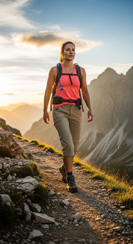 This coral moisture-wicking tank keeps you cool and dry while the convertible hiking pants transform from full-length to shorts as temperatures rise throughout your trek. The quick-dry fabric technology pulls sweat away from your skin preventing chafing during long uphill climbs and strenuous descents. Multiple zippered pockets secure your phone, keys, and snacks while the adjustable waistband ensures a comfortable fit that moves with your body. The vibrant coral color brightens your mood while providing visibility on crowded trails and photographing beautifully against mountain backdrops. UPF 50+ protection shields your skin from harmful rays during exposed ridge walks and summit pushes. This versatile combination transitions seamlessly from challenging hikes to casual post-trail brewery visits with friends.