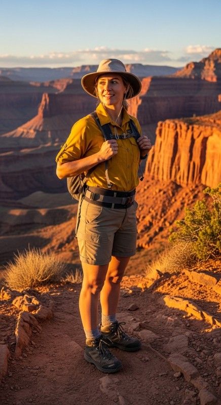 This mustard breathable safari shirt brings adventure-ready style to the trail with moisture-wicking fabric, roll-up sleeves, and multiple pockets for organized storage of trail essentials. The relaxed fit allows easy movement and layering while the button-front design enables ventilation adjustment as temperatures fluctuate throughout your hike. Paired with khaki hiking shorts featuring a supportive waistband and secure pockets, this outfit balances explorer aesthetics with modern performance technology. The shorts’ quick-dry fabric handles sweat and weather while the gusseted crotch prevents binding during high steps and technical terrain. Mustard yellow is warm and earthy, complementing natural landscapes while showing less dirt than lighter colors during muddy trail sections. This adventurous combination is perfect for multi-day hikes, backpacking trips, or any expedition where style and function must work together.