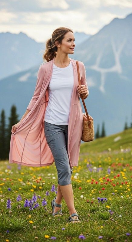 This rose quartz lightweight duster adds feminine elegance and sun protection to your hiking wardrobe with flowy, breathable fabric that moves beautifully without restricting movement. The open-front design allows ventilation while the three-quarter length provides coverage for arms and upper legs during trail adventures. Layered over a white performance tee and paired with gray hiking capris, this outfit balances bohemian style with athletic functionality for unique mountain fashion. The moisture-wicking tee keeps you dry while the quick-dry capris feature articulated knees and pockets for all-day trail comfort. Rose quartz is soft and romantic, creating dreamy vibes in outdoor photos while the duster’s packability means easy storage when temperatures rise. This feminine combination proves hiking outfits can be both beautiful and functional for women who want to express their personal style on the trail.