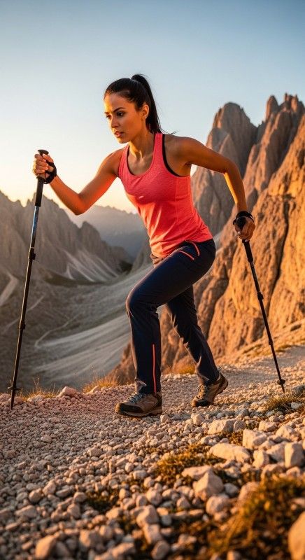 This coral performance racerback features strategic seam placement that prevents chafing while the moisture-wicking fabric keeps you dry during intense uphill climbs and sweaty descents. The fitted silhouette reduces fabric bulk while the extended length provides coverage during bending and reaching movements on technical terrain. Paired with navy trail pants featuring a gusseted crotch and zippered ankle cuffs, this outfit provides full-leg protection without sacrificing breathability or mobility. The pants’ quick-dry fabric handles stream crossings and rain while the articulated knees prevent binding during high steps and scrambling sections. Coral and navy create a striking color combination that photographs beautifully while the performance fabrics ensure all-day comfort. This athletic ensemble is ideal for challenging hikes, peak bagging, or any adventure where performance and style must work together seamlessly.