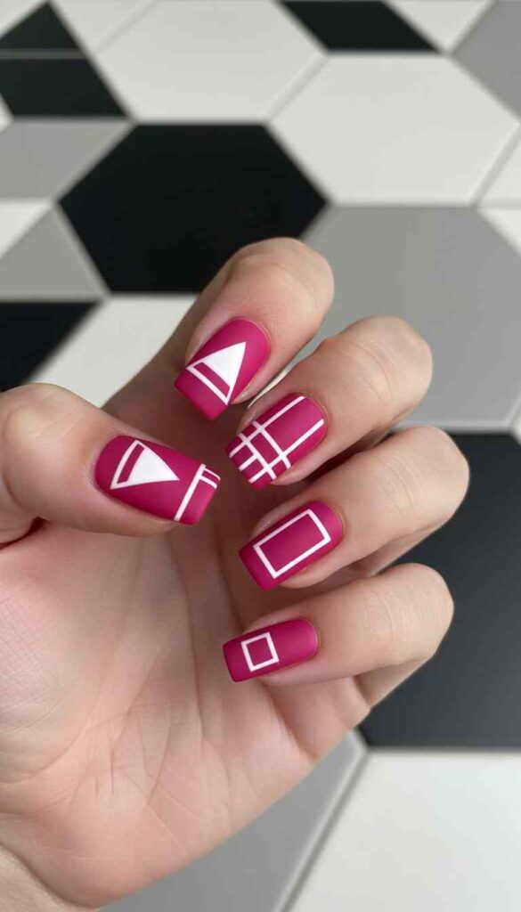 Electric magenta with bold geometric pattern creates graphic design statement.