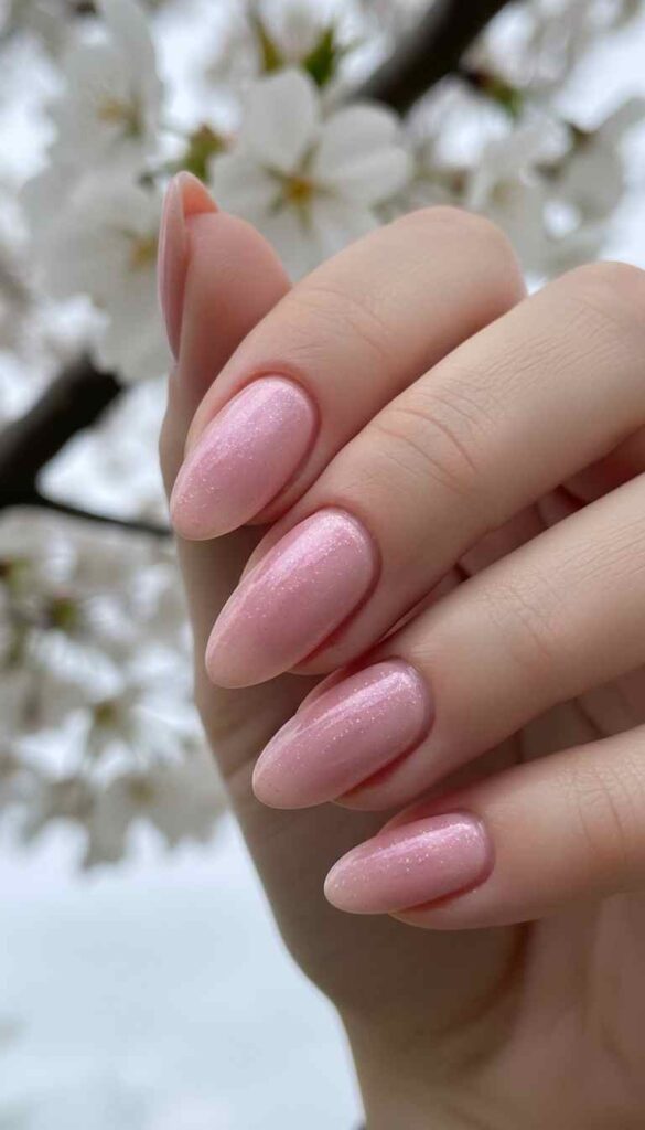 Soft powder pink with pearl shimmer creates delicate light-catching pastel elegance.