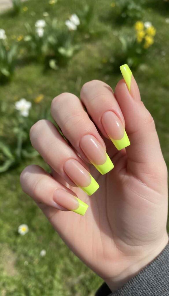Electric yellow French tips on nude base creates maximum modern bold impact.