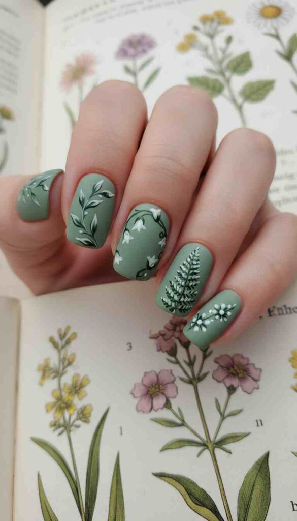 Soft sage green with delicate hand-painted botanical illustrations creates nature-inspired pastel art.