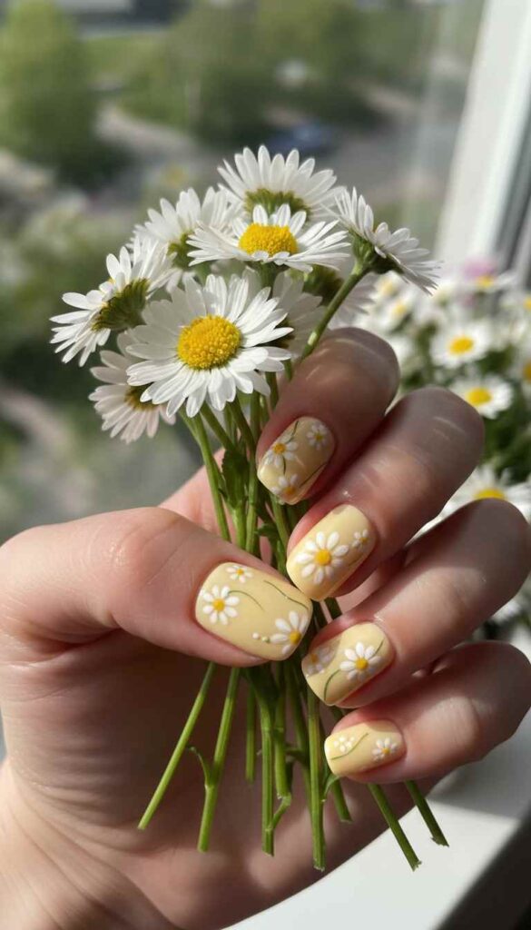 Pale yellow base with hand-painted white daisies creates sweet gentle spring story.