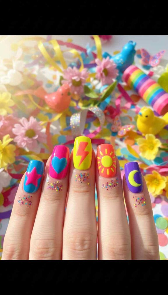 Every nail in different bold vibrant color with contrasting accent detail creates joyful maximalist celebration.