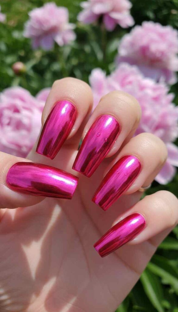 Full-coverage hot pink chrome creates metallic bold statement with dimensional shine.