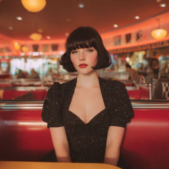 Retro-inspired sophistication. Rounded bob shape with straight-across bangs creates 1960s modern fusion.