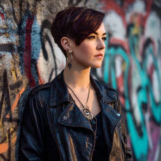 Textured dimensional short. Razored choppy layers create movement and height in pixie cut.
