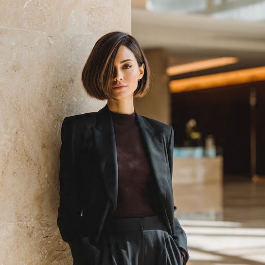 Precision meets polish. Sharp one-length bob cut at chin creates sleek sophisticated statement.