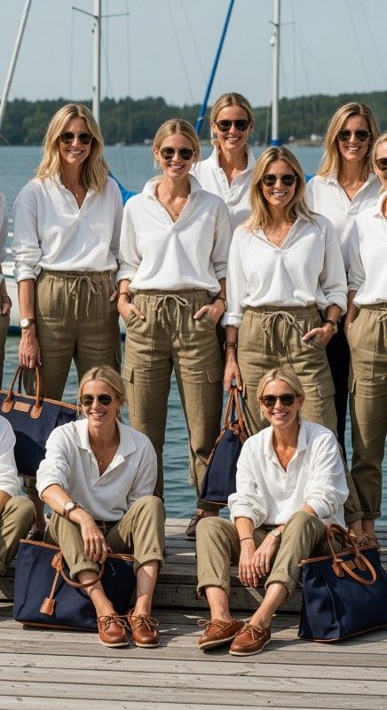 An oversized cream colored pique polo shirt with a relaxed collar and slightly dropped shoulders creates preppy cool with modern proportions and effortless style. Tuck loosely into high-waisted khaki linen cargo pants with a drawstring waist for utilitarian chic meets relaxed comfort. Brown leather boat shoes add classic nautical vibes and comfortable support for walking or standing. A navy canvas tote bag with leather handles brings practical functionality and timeless style to the ensemble. Classic aviator sunglasses and a simple leather watch complete this refined casual look perfectly. Ideal for weekend getaways, casual Fridays, or relaxed outdoor gatherings with friends.