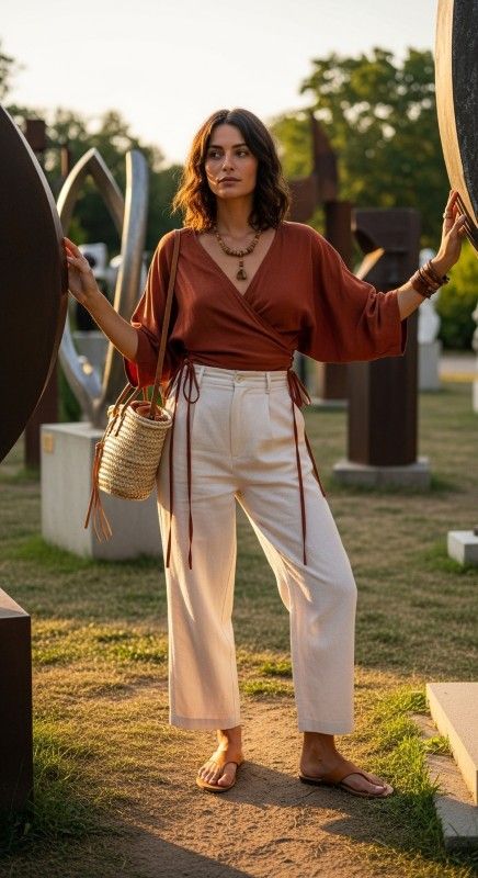An oversized rust colored wrap top in lightweight rayon drapes beautifully with adjustable ties that allow for customized fit and comfort throughout the day. Pair with high-waisted cream wide-leg linen pants that flow gracefully and keep you cool in warm temperatures. Tan leather thong sandals with minimal detailing maintain the earthy, relaxed aesthetic while providing comfortable support. A woven straw bag with leather handles adds natural texture and practical storage for summer essentials. Wooden bead necklace and stacked leather bracelets enhance the bohemian, earthy vibe of the outfit. Perfect for outdoor dinners, art gallery visits, or casual creative workspace settings.