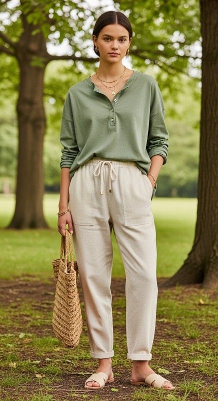 An oversized sage green cotton henley shirt with a relaxed fit and button placket creates laid-back comfort with subtle detailing and effortless style. Wear with slouchy cream linen drawstring pants that pool slightly at the ankles for maximum relaxation and breathability. Natural leather slide sandals with minimal straps keep the look earthy and comfortable for all-day wear. A woven jute tote bag adds organic texture and practical storage for your summer essentials and daily items. Simple gold jewelry including a delicate necklace and thin bracelets keeps accessories minimal and intentional. This comfortable yet stylish look is perfect for weekend lounging, casual errands, or relaxed outdoor activities.