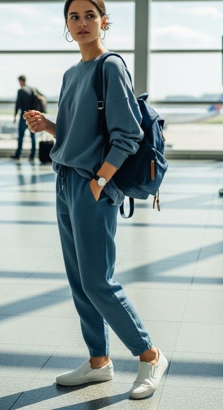 An oversized heather blue cotton sweatshirt in lightweight summer fabric creates cozy comfort without bulk during cooler summer evenings or air-conditioned environments. Pair with matching heather blue linen-blend joggers that taper at the ankle for a coordinated relaxed look. White leather slip-on sneakers add clean minimalism and easy on-and-off convenience for casual days. A navy canvas backpack with leather details provides practical storage and youthful casual style. Simple silver hoop earrings and a minimalist watch keep accessories refined even in casual loungewear. This elevated athleisure look works perfectly for travel days, running errands, or comfortable weekend wear.