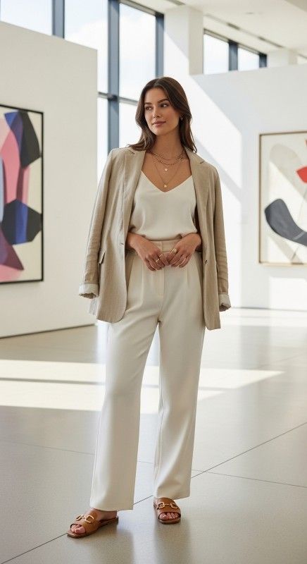 An oversized ivory silk camisole with adjustable straps and a relaxed fit creates luxurious comfort when layered under an unstructured beige linen blazer. The flowing silk drapes beautifully while the breathable linen blazer provides coverage without overheating in warm weather. High-waisted cream wide-leg trousers complete the monochromatic neutral palette with elegant flow. Tan leather slide sandals with gold hardware add polished minimalism to the sophisticated neutral ensemble. Delicate gold layered necklaces and simple rings keep jewelry refined and intentional. This look demonstrates that oversized pieces can be incredibly chic for creative professional settings or elevated casual occasions.