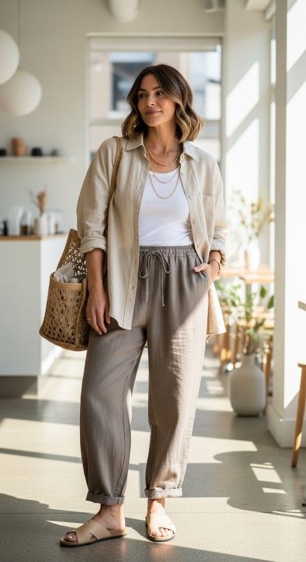 An oversized beige linen button-down shirt worn open over a simple white tank creates the perfect foundation for relaxed summer dressing with breathable comfort. Pair with slouchy taupe linen drawstring pants that pool slightly at the ankles for an effortlessly cool silhouette. Natural leather slide sandals with minimal straps keep the look grounded and earthy while providing all-day comfort. A woven jute tote bag adds organic texture and practical storage for your summer essentials without compromising the laid-back vibe. Delicate gold chain necklaces layered at different lengths provide subtle sophistication against the neutral palette. This monochromatic linen ensemble is ideal for casual brunches, gallery visits, or leisurely weekend wandering.