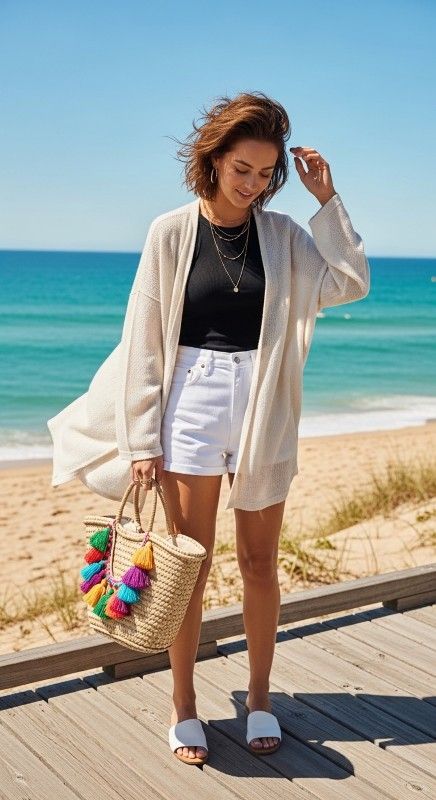 An oversized cream colored open-front cardigan in lightweight cotton creates a perfect layering piece over a simple black tank and high-waisted white shorts. The relaxed drape and breathable fabric provide coverage without bulk during warm summer days and evenings. White leather slide sandals with minimal straps keep the look clean and effortless while providing all-day comfort. A natural straw tote with colorful tassel details adds bohemian charm and practical storage for beach days or markets. Layered gold necklaces and simple hoop earrings keep accessories minimal and polished. This versatile layered look works perfectly for beach cover-ups, casual errands, or relaxed outdoor gatherings.