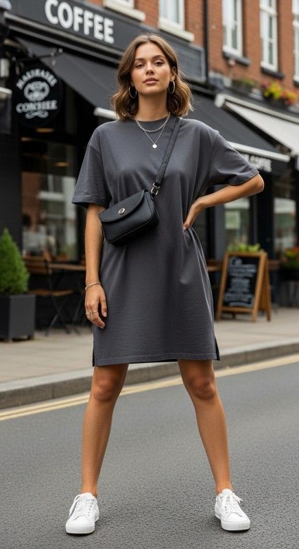 An oversized charcoal gray cotton t-shirt dress with a relaxed fit and side slits creates effortless casual cool that’s perfect for warm summer days and active lifestyles. The breathable fabric and loose silhouette provide maximum comfort while still looking intentionally styled and put-together. White canvas sneakers with minimal branding add sporty youthful energy and all-day walking comfort to the casual dress. A black leather belt bag worn crossbody keeps essentials secure and hands-free for busy active days. Simple silver jewelry including hoop earrings and a delicate chain keeps accessories minimal and modern. This easy wear look is ideal for running errands, casual coffee dates, or relaxed weekend activities.