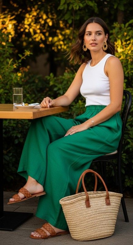 Oversized emerald green linen palazzo pants with an elastic waistband create dramatic flow and movement while keeping you cool and comfortable in warm summer temperatures. Pair with a simple white fitted tank top to balance the volume of the wide legs with a more fitted silhouette on top. Tan leather flat sandals with braided details add earthy texture and comfortable support for extended wear. A natural woven tote bag with leather handles brings organic texture and practical storage to the elegant ensemble. Gold statement earrings and a delicate bracelet keep accessories refined without overwhelming the dramatic pants. Perfect for outdoor dinners, cultural events, or making a stylish statement with comfort.