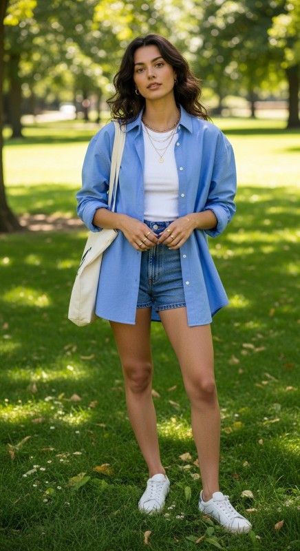 An oversized powder blue oxford button-down shirt in lightweight cotton creates preppy relaxed cool when worn open over a white tank with high-waisted denim shorts. The relaxed fit and breathable fabric make it perfect for casual summer days when you want effortless style and comfort. White leather sneakers add clean minimalism and all-day walking comfort to the casual layered look. A natural canvas tote in cream keeps the palette light and provides practical storage for daily essentials. Delicate gold jewelry including layered necklaces and simple rings keeps accessories refined and intentional. This versatile look transitions seamlessly from casual errands to lunch dates with friends.