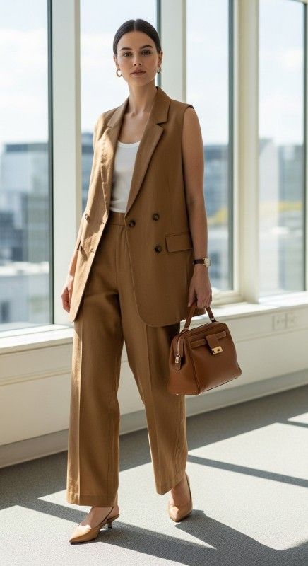 An oversized camel colored linen vest worn over a simple white tank creates sophisticated layering without bulk during warm summer days and professional settings. Pair with matching camel linen wide-leg trousers for a coordinated monochromatic look that’s both polished and comfortable. Nude pointed-toe flats with a low kitten heel add refined polish without sacrificing all-day comfort and wearability. A structured tan leather handbag complements the camel palette and provides professional organization for work essentials. Minimalist gold jewelry including a delicate watch and simple earrings keeps the look polished and intentional. This elevated oversized look works perfectly for creative workplace environments or business casual meetings.