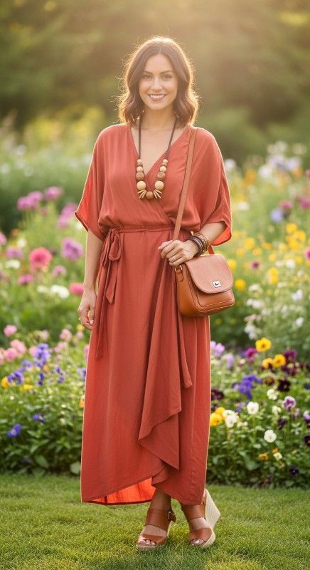 An oversized terracotta colored wrap dress in lightweight rayon creates adjustable comfort with a flattering silhouette that’s perfect for various body types and warm summer occasions. The flowing fabric and relaxed fit provide breathability while the wrap style allows for customized fit throughout the day. Tan leather wedge sandals add height and earthy elegance while maintaining comfortable support for extended wear. A cognac leather crossbody bag with adjustable strap provides practical storage and complements the warm terracotta tones beautifully. Wooden bead necklace and stacked leather bracelets enhance the natural bohemian aesthetic of the outfit. Perfect for outdoor weddings, garden parties, or elevated casual summer events.