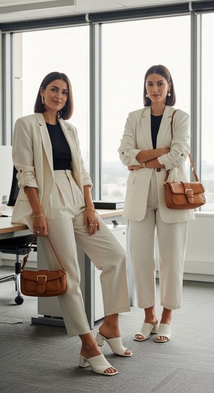 A slouchy ivory boyfriend blazer with rolled sleeves creates sophisticated structure while maintaining relaxed proportions perfect for warm weather professional settings. Style over a fitted black tank top with high-waisted cream wide-leg trousers that flow beautifully with movement. White leather mules with a low block heel provide polished comfort that transitions seamlessly from office to evening drinks. A structured tan leather crossbody bag adds refined contrast to the oversized blazer’s casual drape. Simple pearl stud earrings and a delicate gold bracelet keep accessories minimal and elegant. This look proves that oversized pieces can be incredibly chic for creative workplace environments or business casual meetings.
