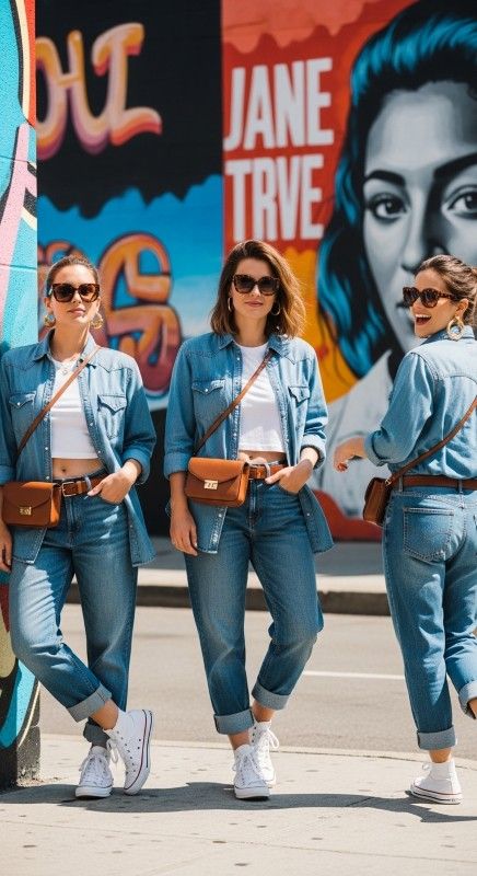 An oversized light-wash denim shirt left unbuttoned over a cropped white tee creates laid-back cool with undeniable summer appeal and effortless style. Combine with baggy medium-wash boyfriend jeans cuffed at the ankles to show off your favorite sneakers comfortably. Classic white canvas high-tops add youthful energy and all-day walking comfort for urban exploration or casual outings. A vintage-inspired brown leather belt bag worn crossbody keeps hands free while adding retro charm to the ensemble. Oversized tortoiseshell sunglasses and simple gold hoop earrings complete this effortlessly cool street style look. Perfect for farmers market trips, coffee dates, or casual weekend adventures with friends.