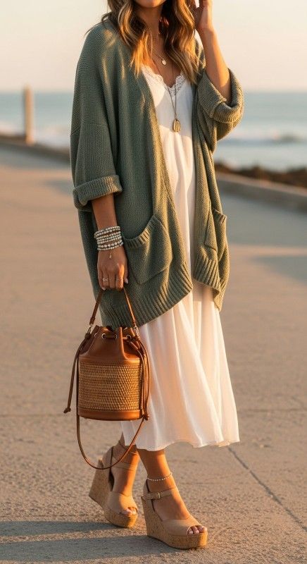 A slouchy sage green oversized cardigan in lightweight cotton drapes beautifully over a simple white slip dress for layered summer elegance without overheating. The dress’s bias cut creates graceful movement while the oversized cardigan provides coverage and textural interest. Natural cork wedge sandals add earthy height and comfortable support for extended wear throughout the day. A rattan bucket bag with leather drawstring closure brings bohemian charm and practical storage to the relaxed ensemble. Layered beaded bracelets in natural tones and a delicate anklet enhance the free-spirited aesthetic perfectly. This look is ideal for beachside dinners, outdoor concerts, or romantic sunset strolls along the shore.