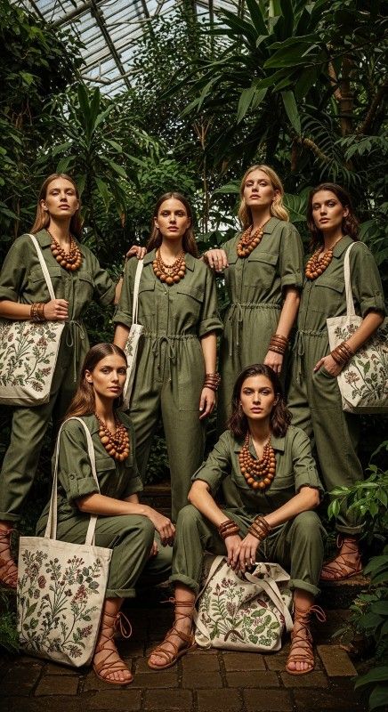 An oversized olive green utility jumpsuit with a drawstring waist and rolled sleeves offers one-and-done dressing with maximum comfort and minimum effort. The relaxed fit through the body and legs creates a flattering silhouette while multiple pockets add practical functionality. Tan leather gladiator sandals that lace up the calf add bohemian flair and keep feet cool in warm weather. A natural canvas tote with colorful embroidered details brings playful personality and ample space for daily essentials. Wooden bead statement necklace and stacked leather bracelets enhance the earthy, adventure-ready aesthetic. Perfect for outdoor festivals, nature walks, or casual weekend exploring with style and comfort.