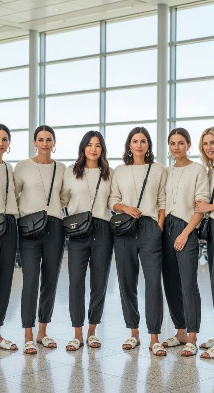 A lightweight oversized cream cashmere sweater in summer-weight yarn provides cozy comfort without bulk during cooler summer evenings or air-conditioned spaces. Pair with slouchy charcoal gray linen-blend joggers that taper slightly at the ankle for refined relaxation and modern comfort. White leather slide sandals with gold hardware add polished minimalism to the casual sweater and jogger combination. A structured black leather crossbody bag provides sleek contrast and practical organization for your essentials. Delicate silver chain necklace and simple geometric earrings keep the look sophisticated yet relaxed. This elevated loungewear-inspired outfit works perfectly for travel days, casual Fridays, or comfortable yet put-together weekend wear.