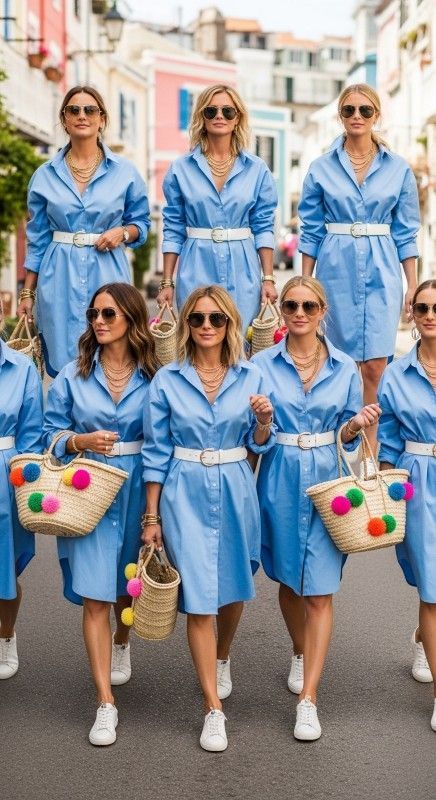 An oversized powder blue cotton shirt dress worn as a dress with a leather belt cinched loosely at the waist creates effortless shape without sacrificing comfort. The relaxed fit through the body and billowy sleeves provide breathability and movement on warm summer days. White leather sneakers with minimal branding add sporty casual cool and all-day walking comfort. A natural straw tote with colorful pom-pom details brings playful beachy vibes and practical storage space. Oversized aviator sunglasses and layered delicate gold necklaces enhance the laid-back yet polished aesthetic. Ideal for running errands, casual lunch dates, or leisurely beach town exploration with style.
